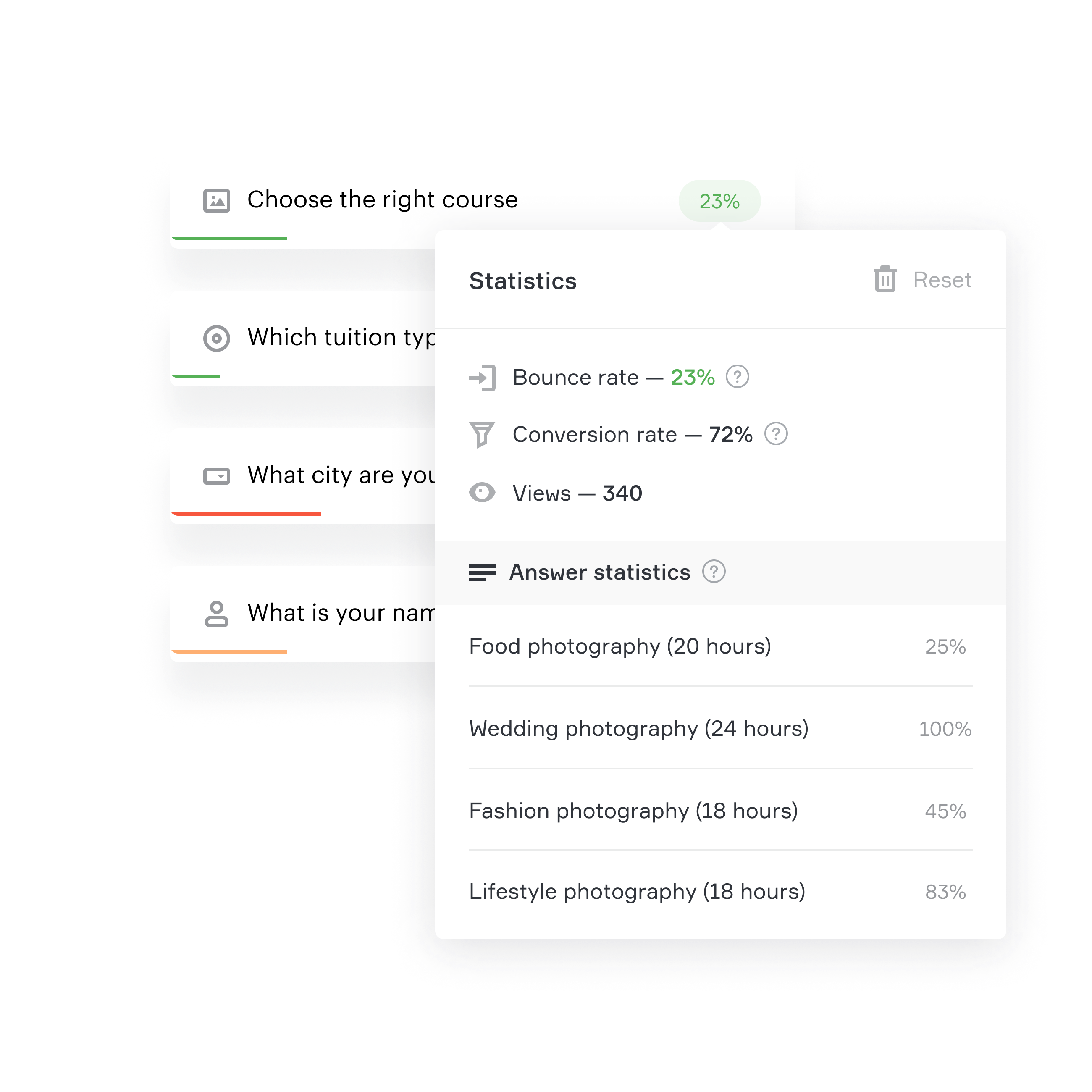 คุณสามารถดูอัตราการออกจากหน้าเว็บสำหรับแต่ละคำถามและเปอร์เซ็นต์ของการเลือกสำหรับตัวเลือกคำตอบทั้งหมด ซึ่งช่วยให้ระบุคำถามที่ทำให้อัตราการออกจากหน้าสูงที่สุด